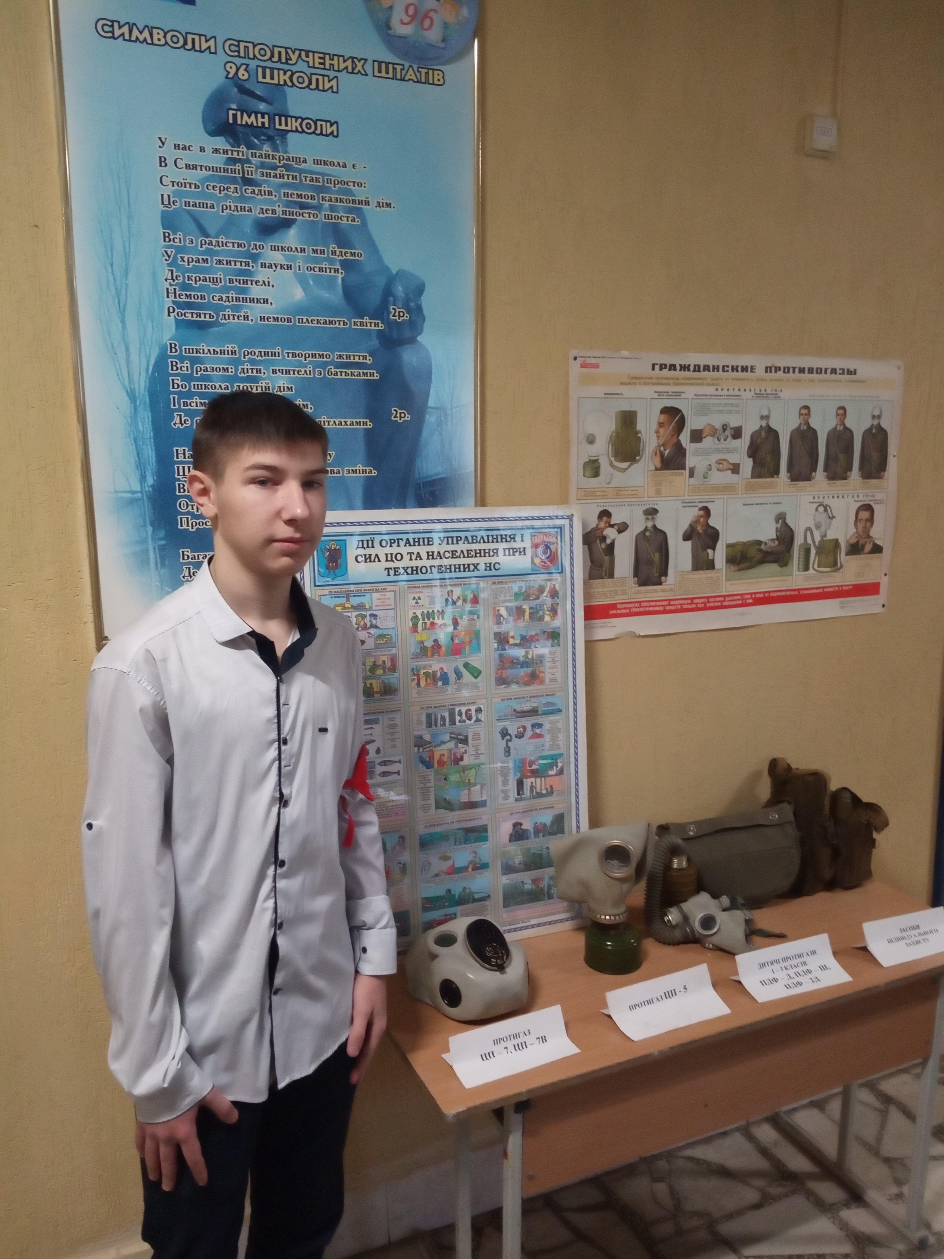 У вестибюлі школи під керівництвом вчителя предмету «Захист Вітчизни» Мамая І.М. було організовано виставку засобів індивідуального захисту при виникненні надзвичайних ситуацій та ознайомлено з правилами їх використання (09.00-15.00). Учні 1-4 класів протягом дня відвідали виставку та за допомогою учнів 11 класу ознайомилися з її експонатами.